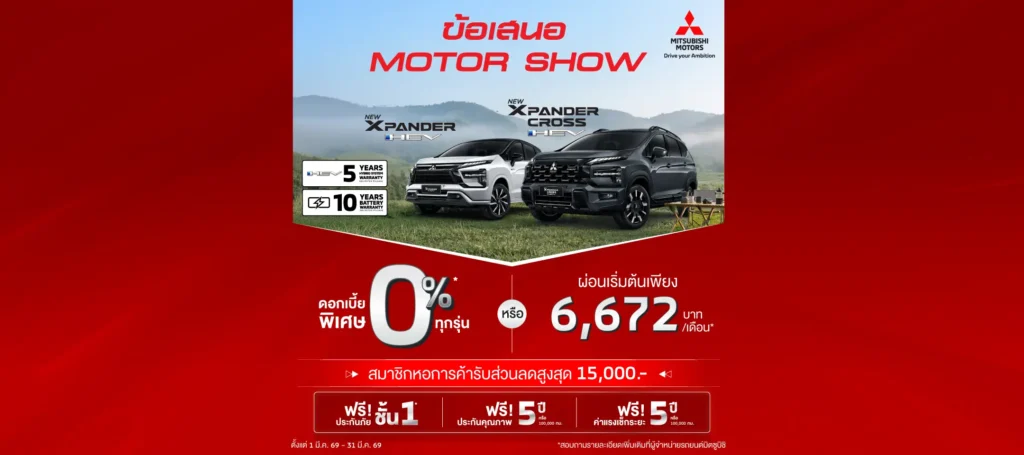 Xpander HEV และ Xpander Cross HEV เลือกรับดอกเบี้ย 0% หรือ ผ่อนเริ่มต้นเดือนละ 6,672 บาท พร้อมฟรีประกันภัยชั้นหนึ่ง นาน 1 ปี