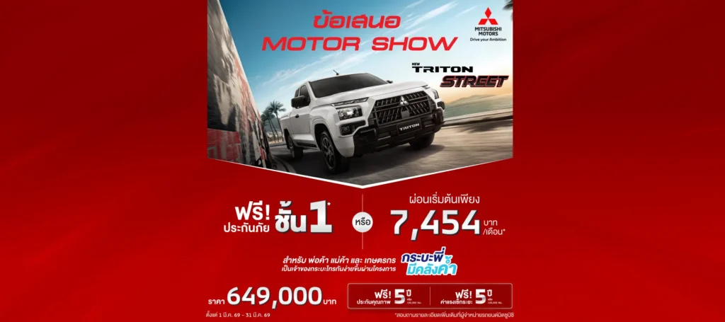 ไทรทัน เมกะ แค็บ สตรีท ราคาเริ่มต้น 649,000 บาท หรือผ่อนเริ่มต้นเดือนละ 7,454 บาท พร้อมฟรีประกันภัยชั้นหนึ่งเชิงพาณิชย์ นาน 1 ปี