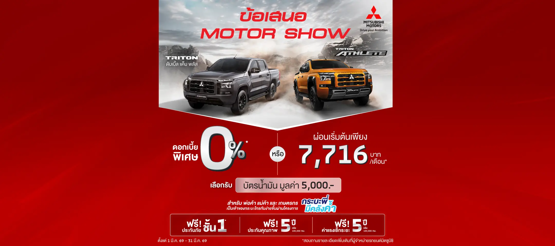ลูกค้าซื้อ มิตซูบิชิ ไทรทัน ดับเบิ้ล แค็บ ยกสูง เลือกรับดอกเบี้ยพิเศษ 0% นาน 48 เดือน หรือ ผ่อนเริ่มต้นเดือนละ 7,716 บาท รุ่น Prime AT พร้อมฟรีประกันภัยชั้นหนึ่ง นาน…